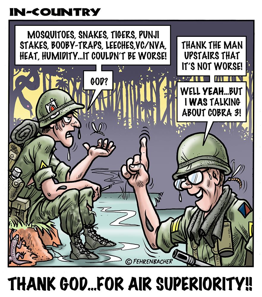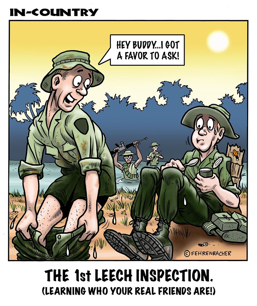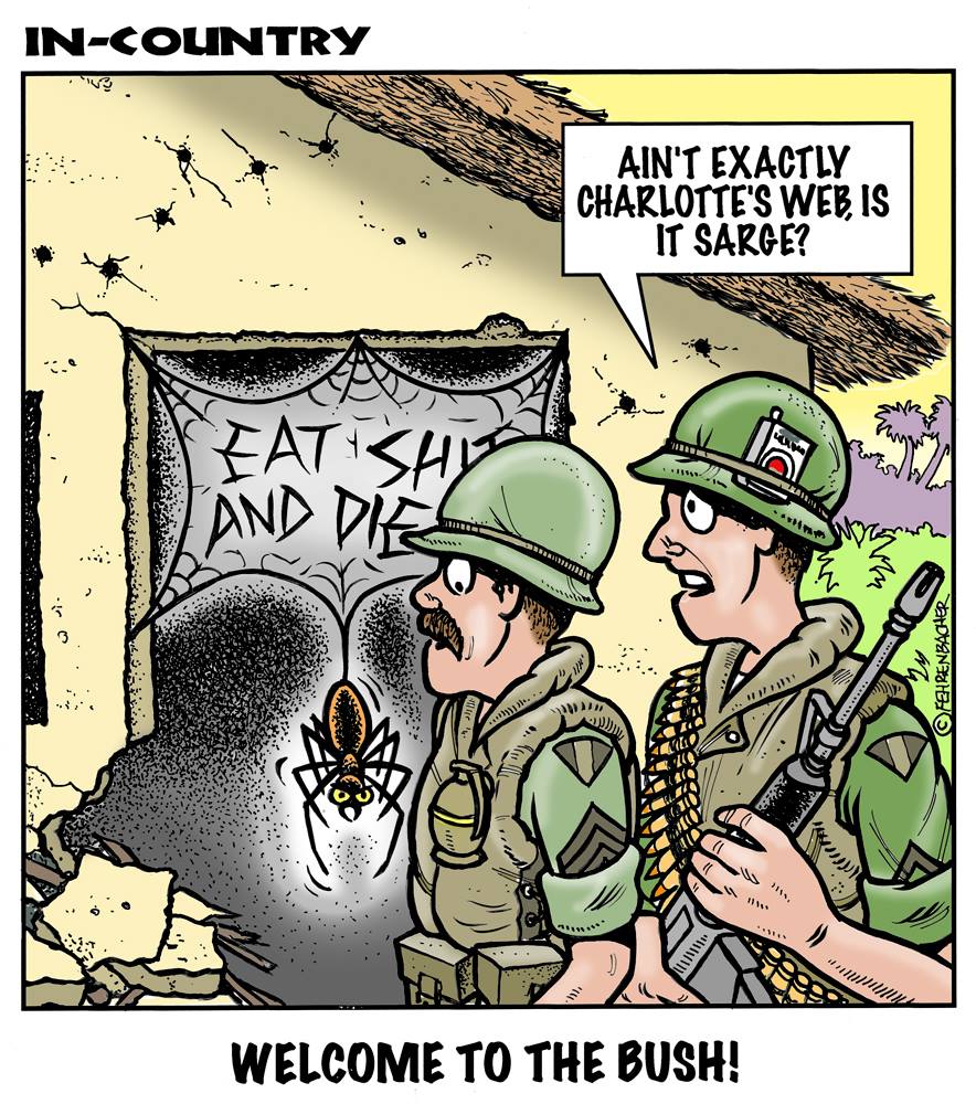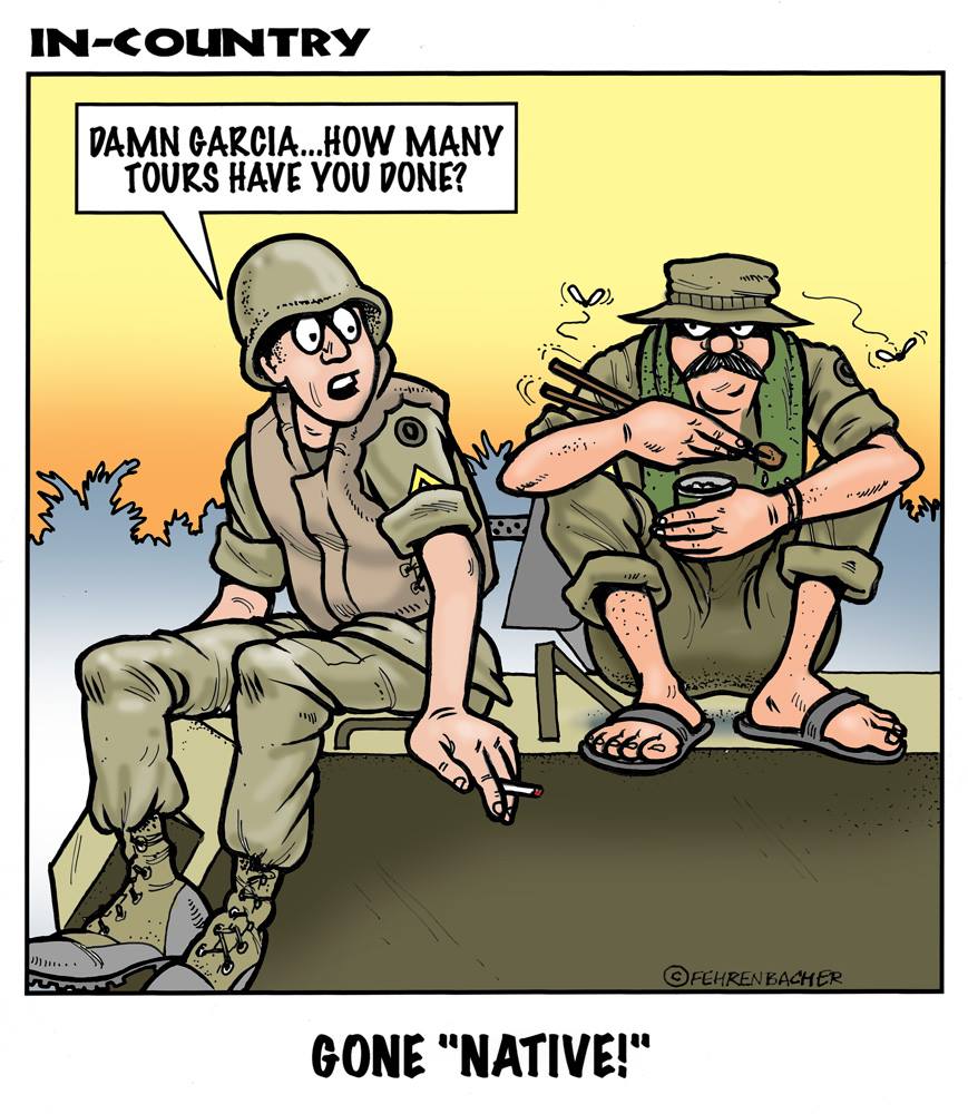 Phil enlisted in the Army in 1965 where you served for years in Vietnam.  He became a graphic designer and has worked for the state of Oregon for 26 years.  He retired in 2003 and started the Cartoon "In-Country".  The cartoons reflect his experiences during his tour of duty in South Vietnam.